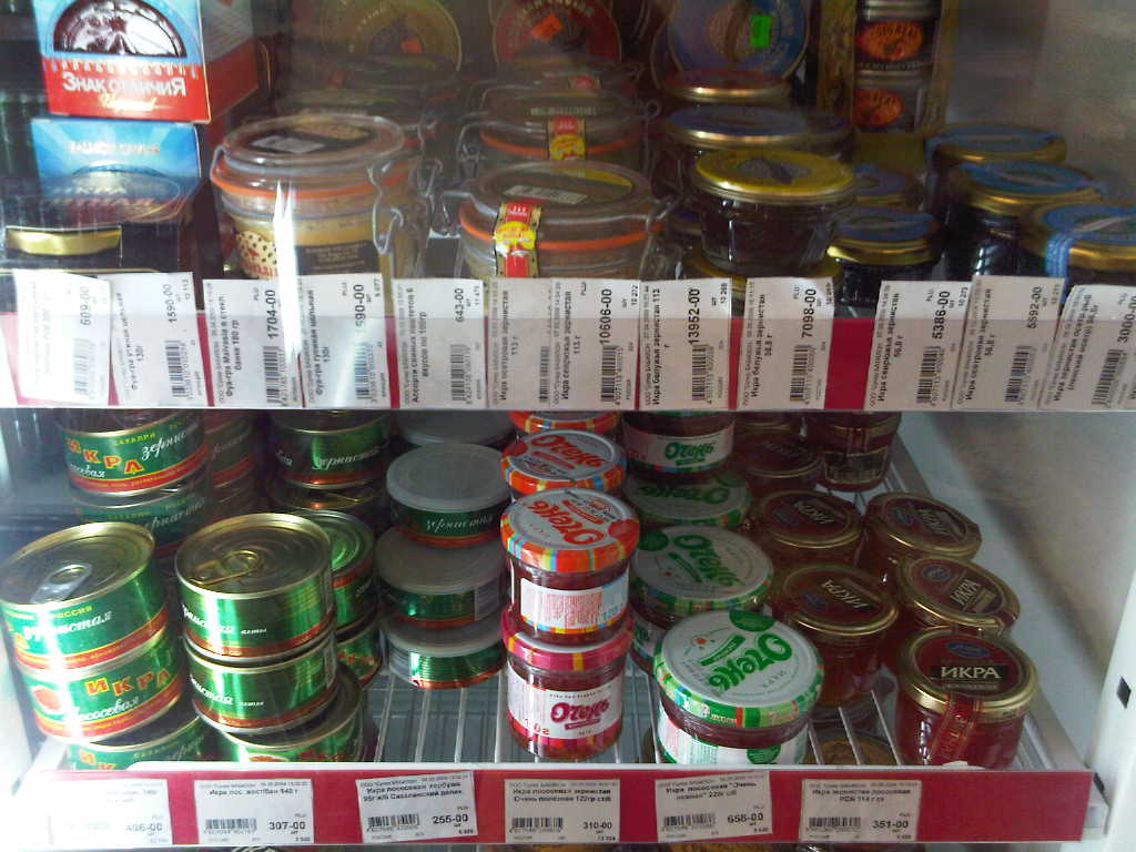 Russian supermarket has a fridge filled with different caviars. Love it.