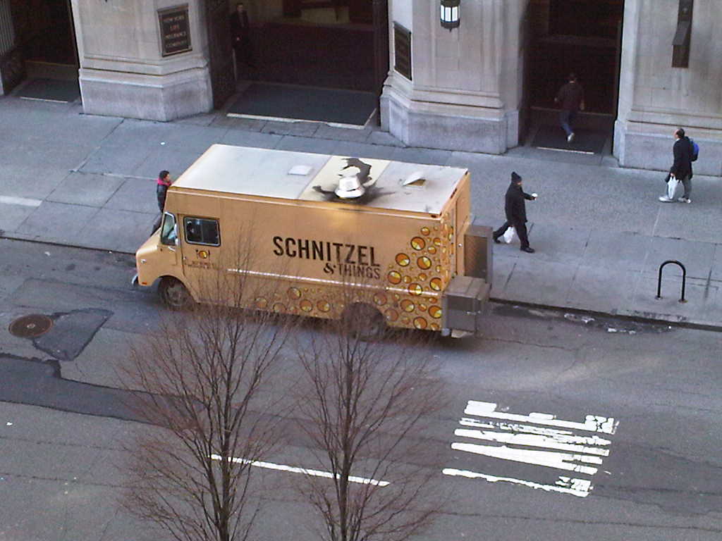 @muggphoto has been telling me about the @SchnitzelTruck‘s visits to Dumbo, and I’m finally in the office one day when it shows up literally across the street from me. I pre-ordered a veal schnitzel platter (limited quantities only). I wasn’t sure what to expect but, lo, it’s a damn big piece of veal schnitzel! Pretty good.
